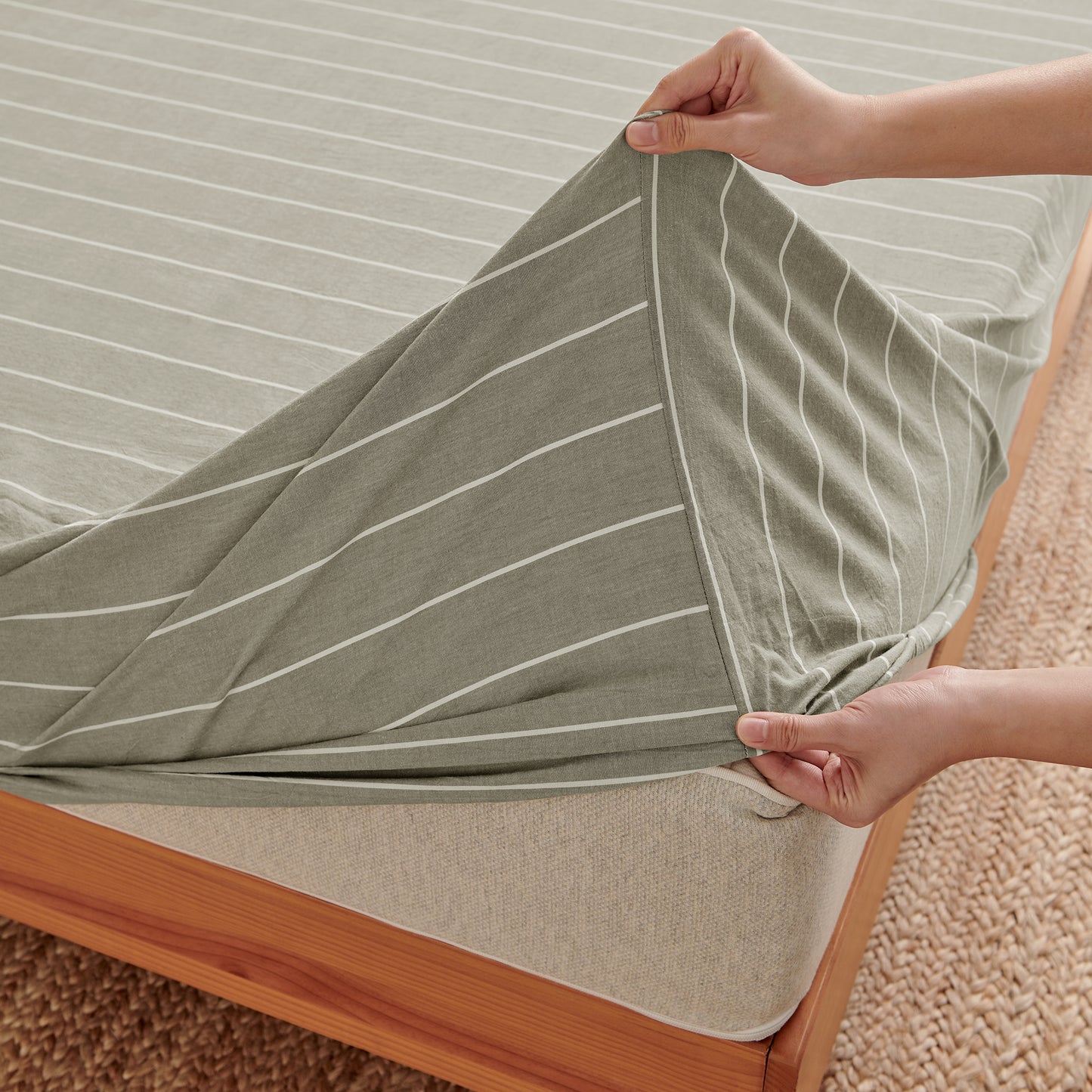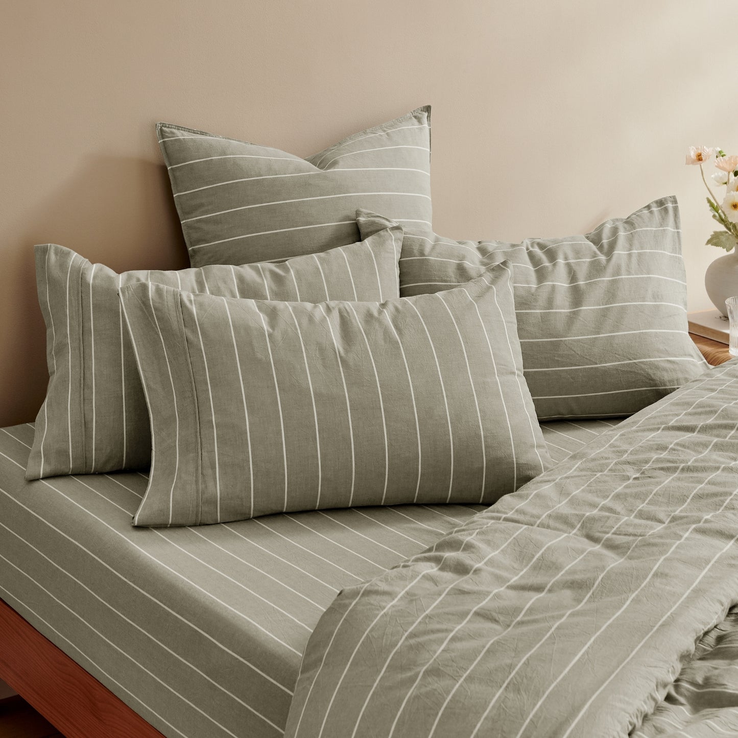 Rumi Washed Cotton Fitted Sheet Set Olive with White Stripe