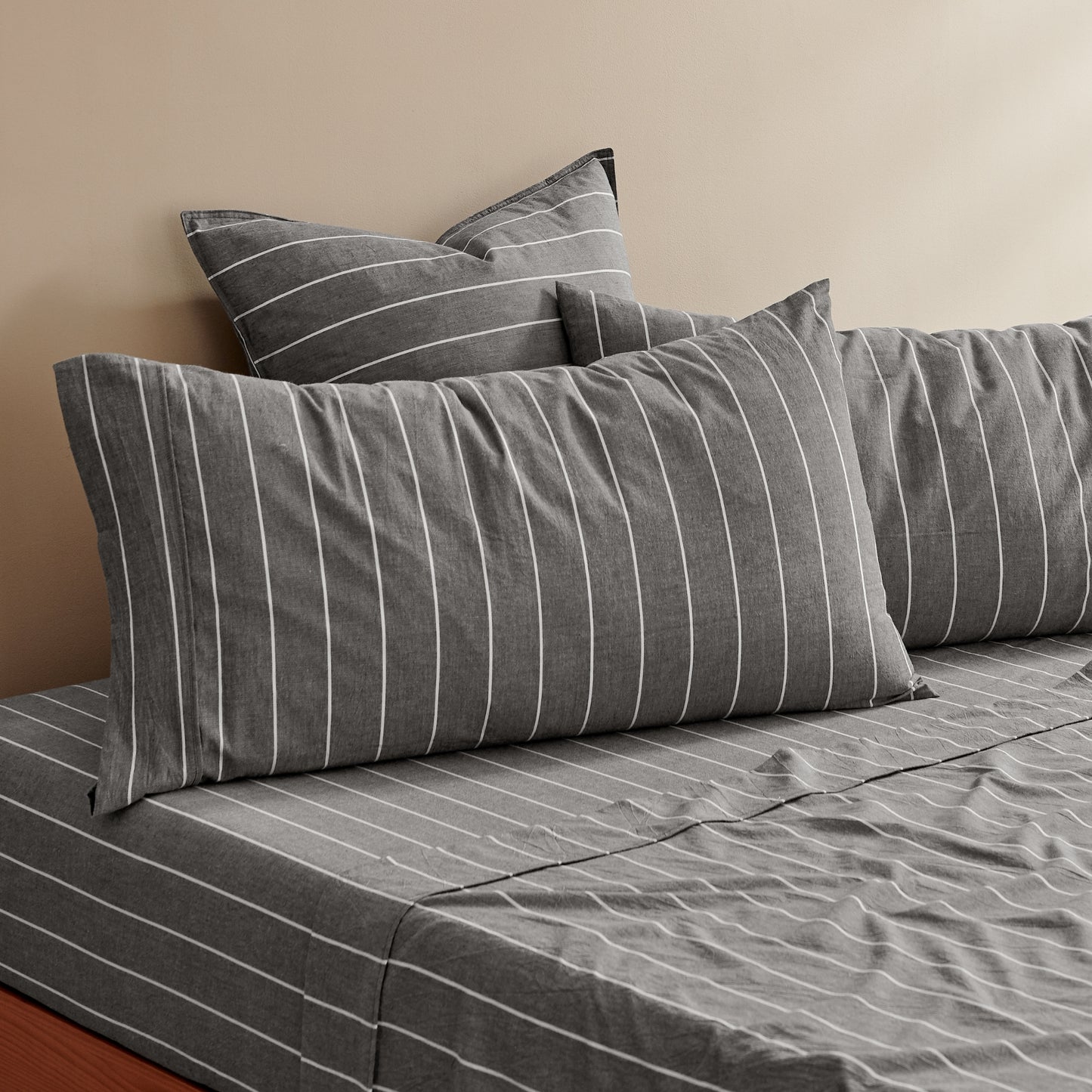 Rumi Washed Cotton King Pillowcase Twin Pack Graphite with White Stripe