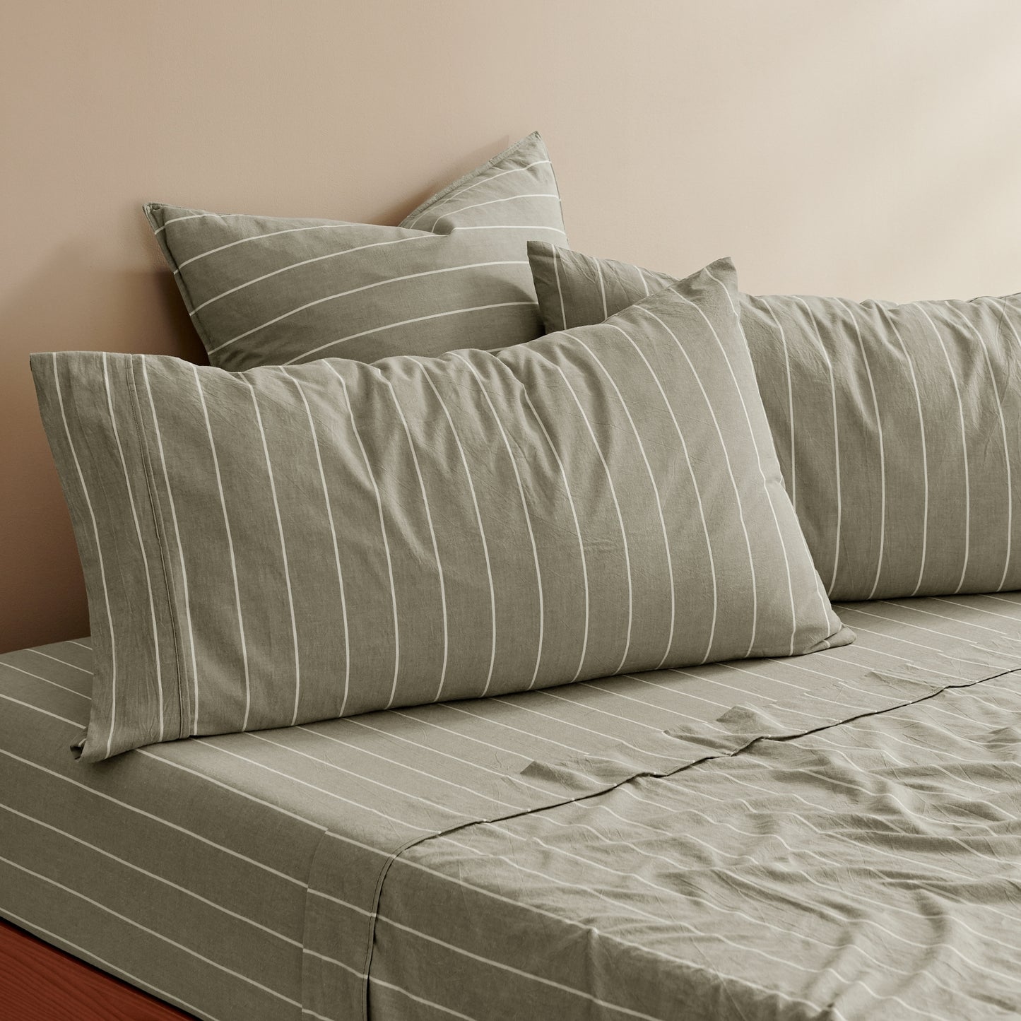 Lay back and relax in the softness of the Dreamaker Rumi Striped Washed Cotton Pillowcases in a twin pack. Made from pre-washed, yarn-dyed cotton, our finely pinstriped pattern is woven to lock in rich colour and detail, while the washed finish creates a lived-in, relaxed feel with a matte texture that only gets better with time. Mix and match your stripes with our Rumi Reversible Stripe Quilt Cover Sets and Sheet Sets for a playful style.