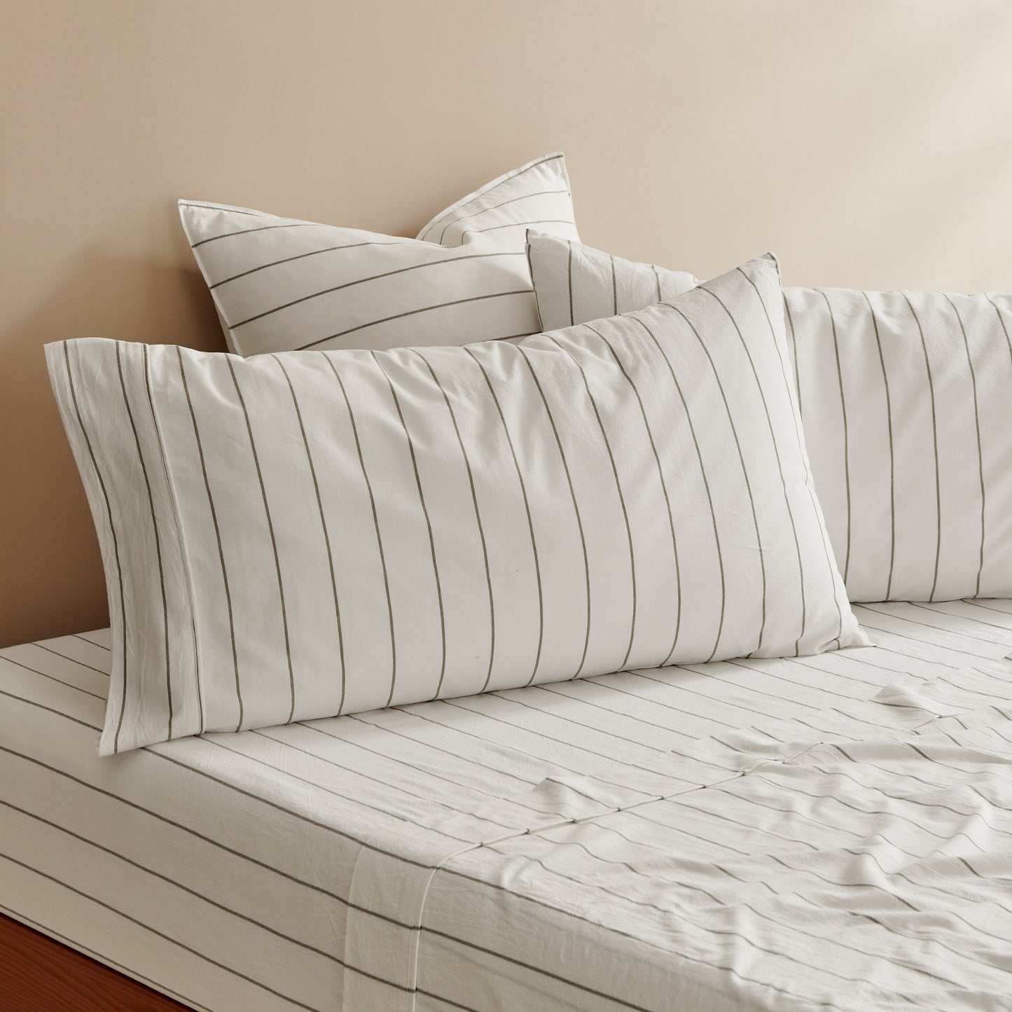 Rumi Washed Cotton King Pillowcase Twin Pack White with Olive Stripe