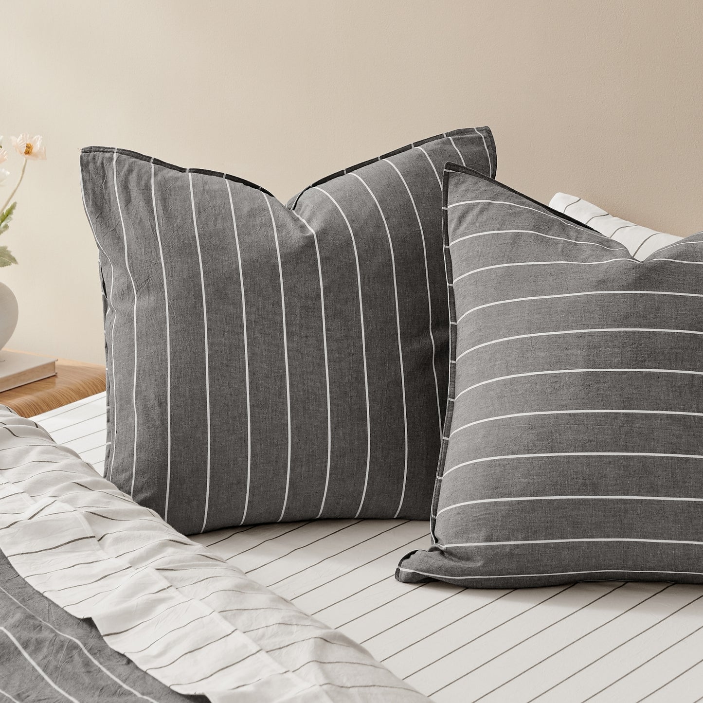 Rumi Washed Cotton Reversible European Pillowcase Twin Pack Graphite with White Stripe