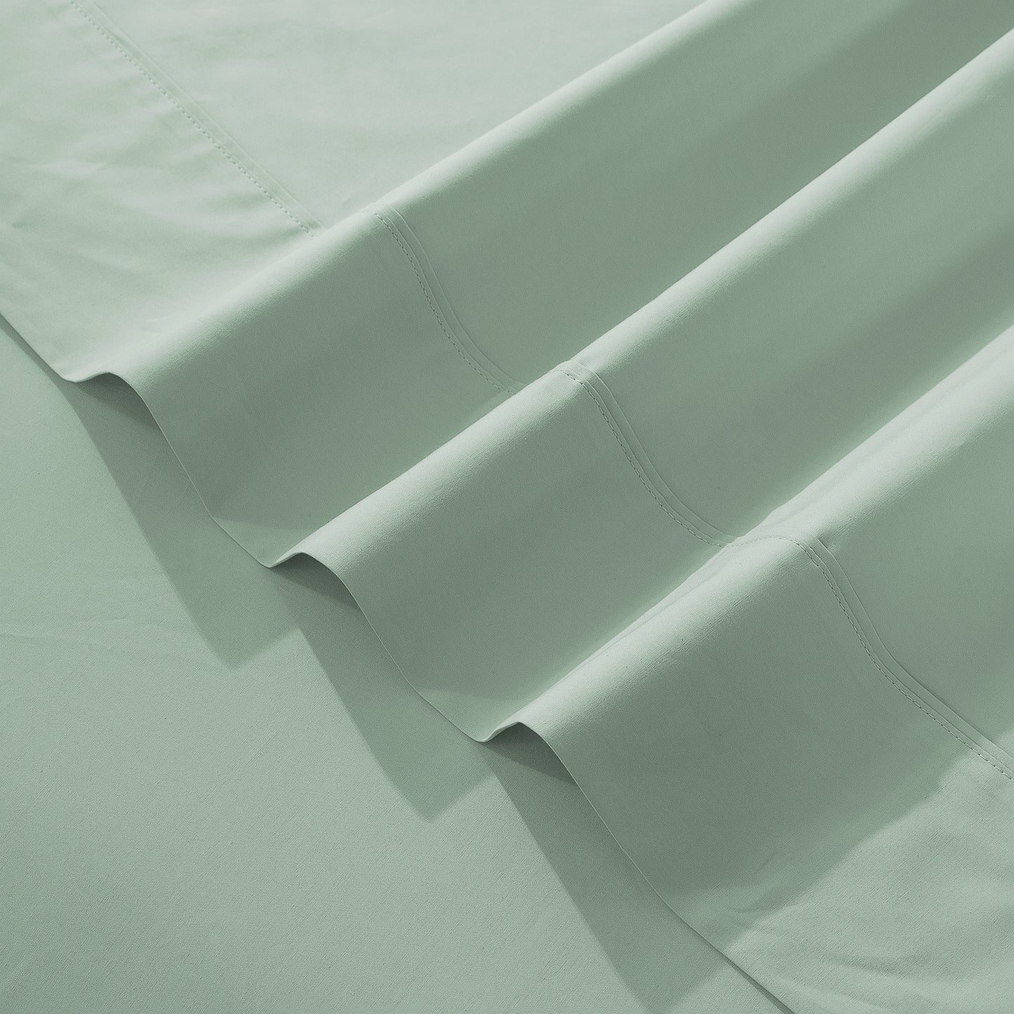close-up of sage green cotton percale sheet set with stitched hem detail