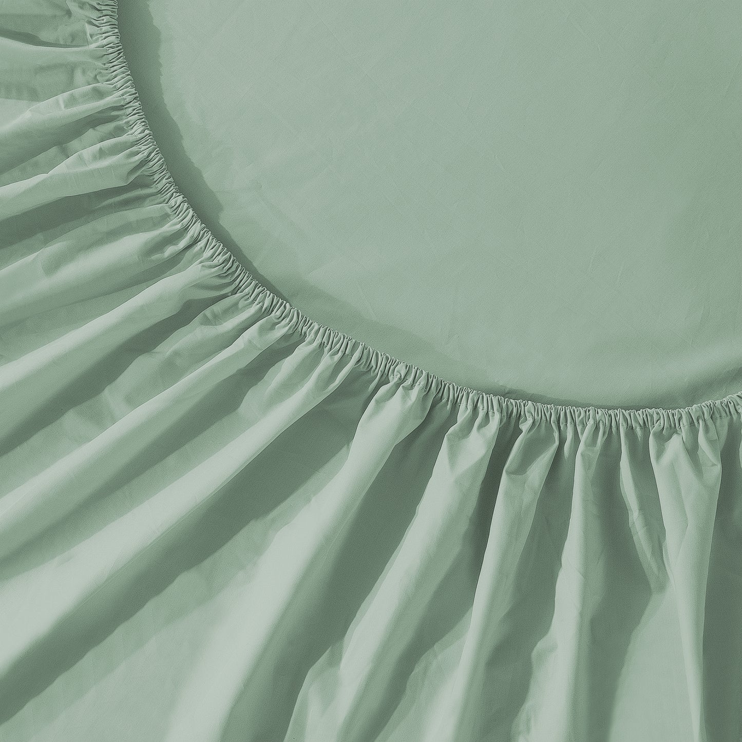 close-up of sage green cotton percale fitted sheet with elastic edge