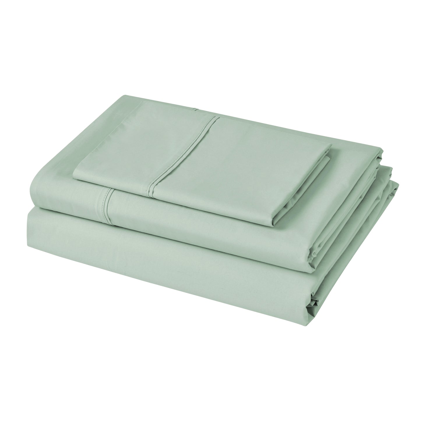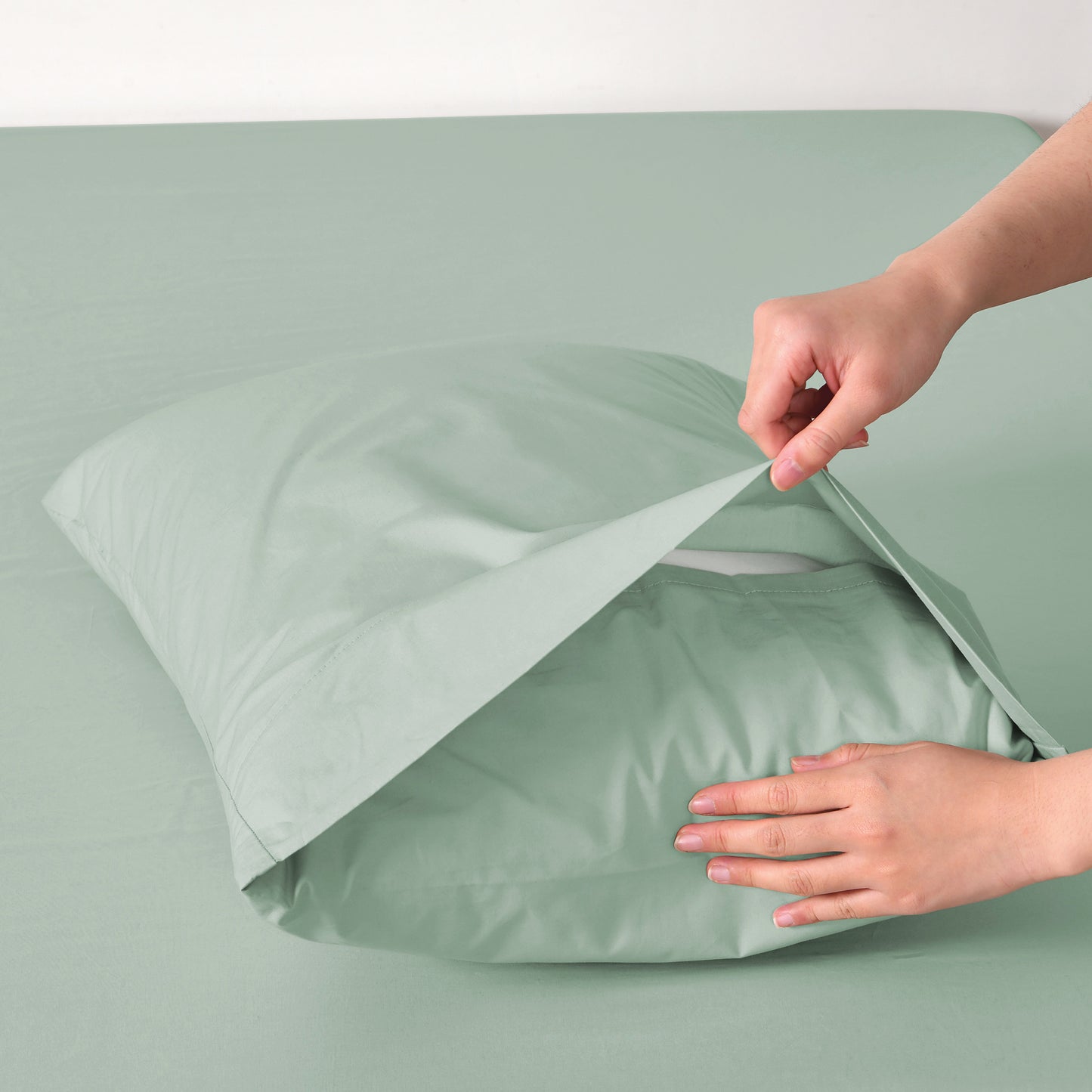 sage green cotton percale sheet set on bed with pillows and bedside table