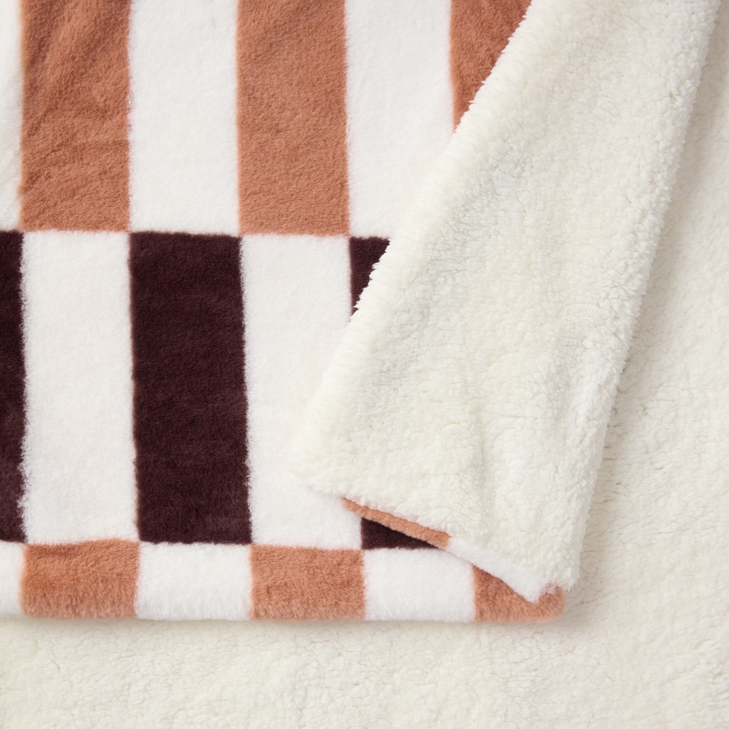 Warm up in style with the Dreamaker Alma Tile Print Faux Fur Throw Blanket in rich, earthy tones. Our designer throw rug pairs velvety, tile-inspired, checkered faux fur on one side, with the cosy warmth of sherpa fleece on the reverse, giving you two sumptuous textures that strike a balance between playful and sophisticated. Create a layered look by styling with cushions from Dreamaker's signature plush faux fur collection.