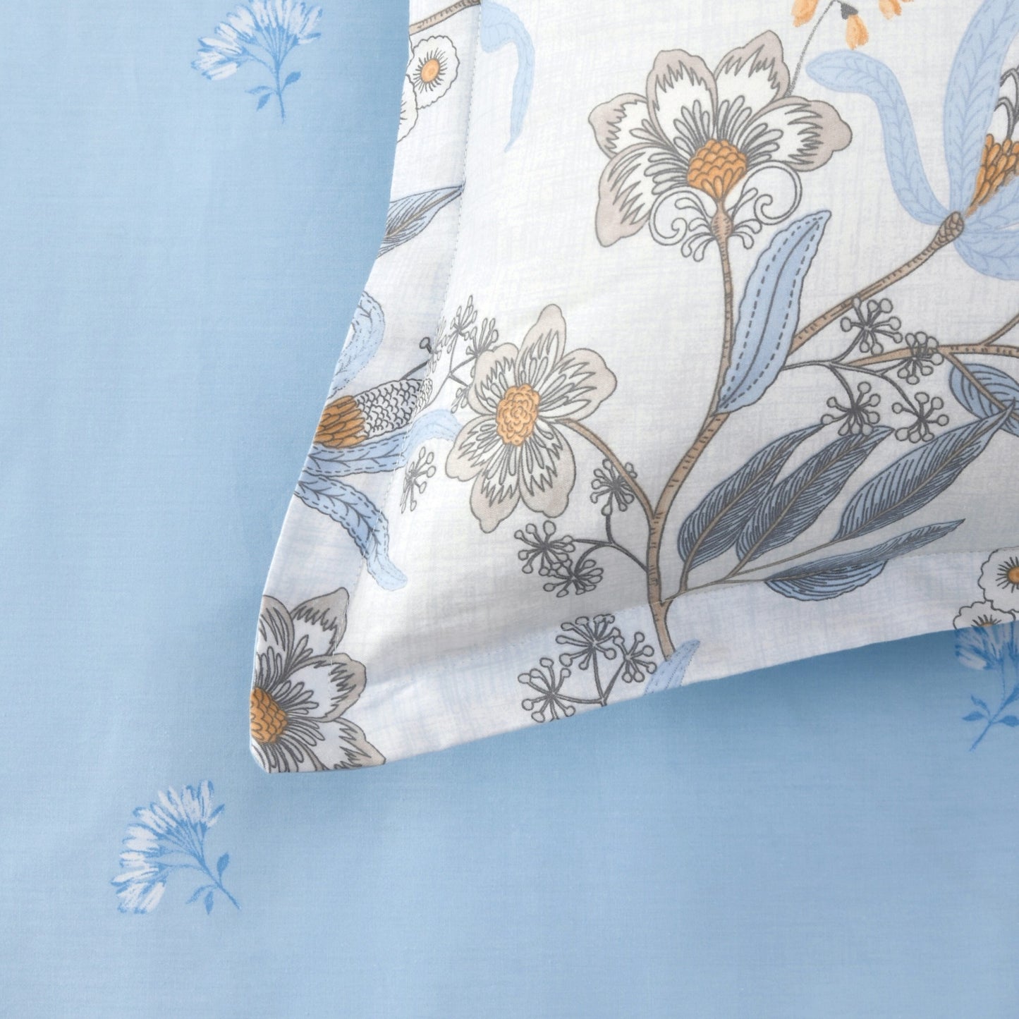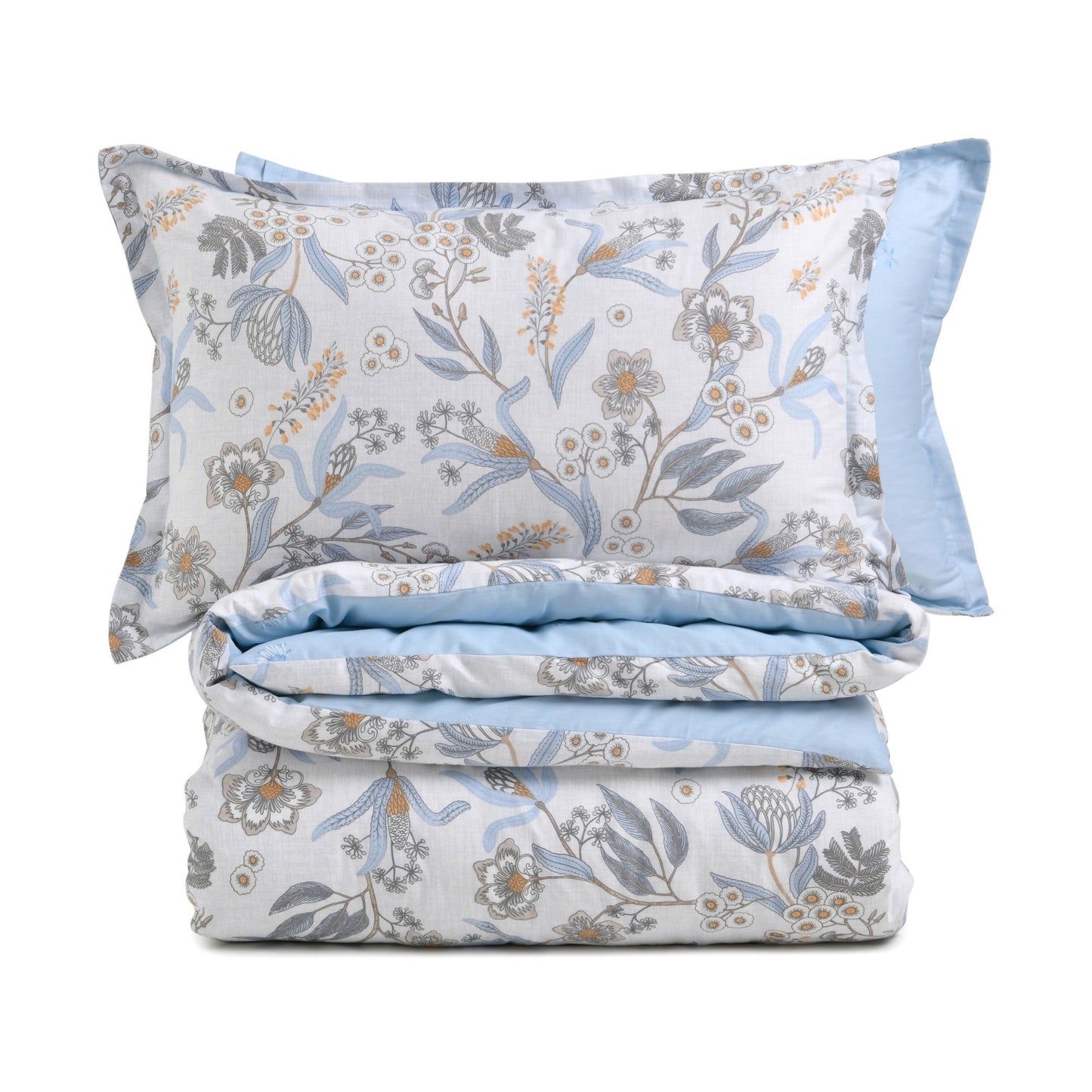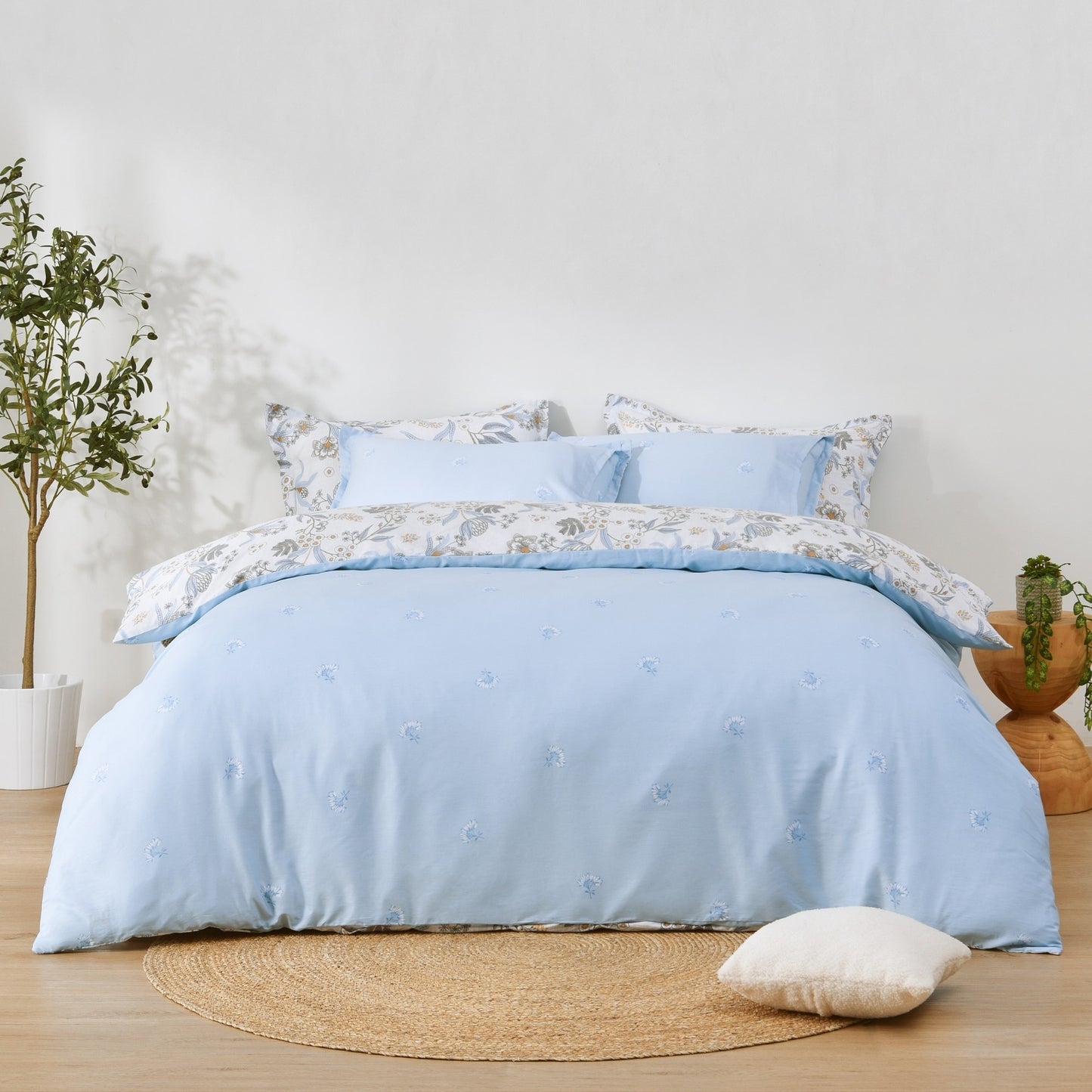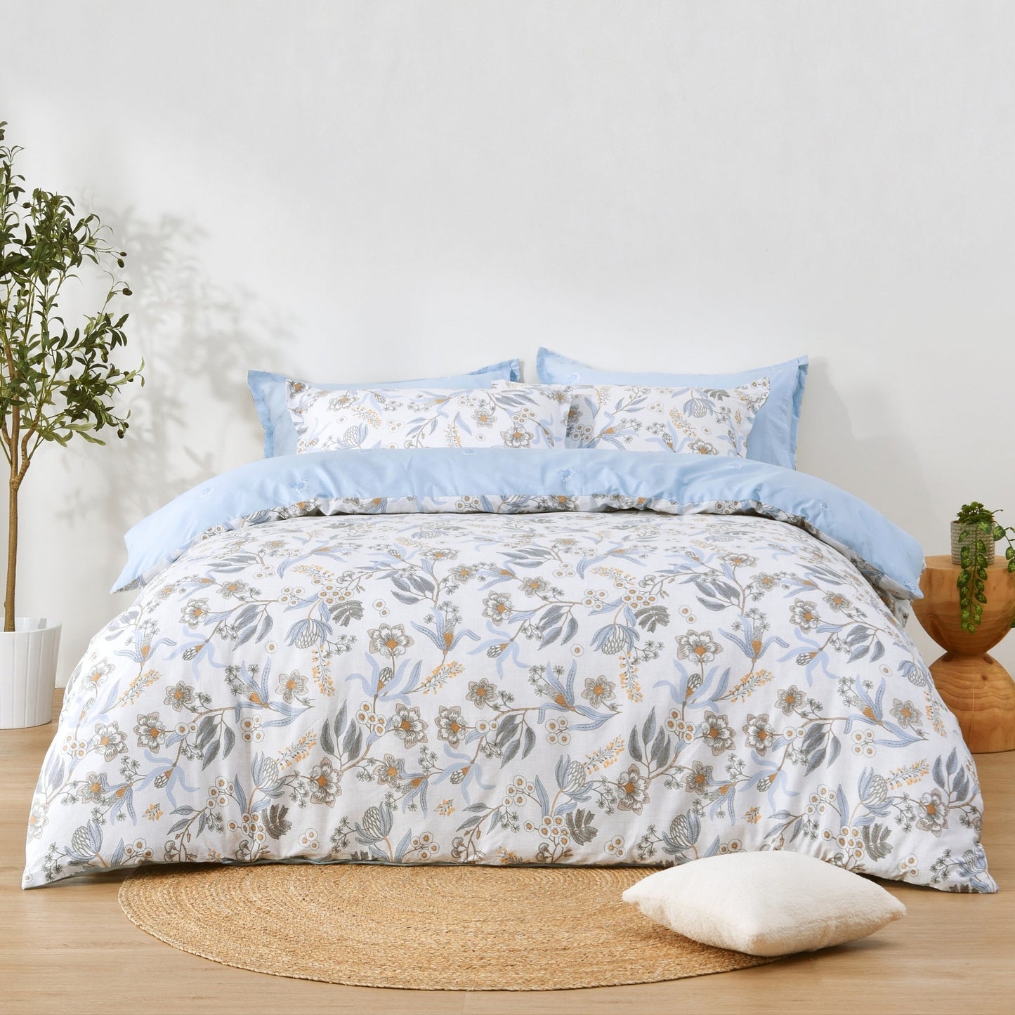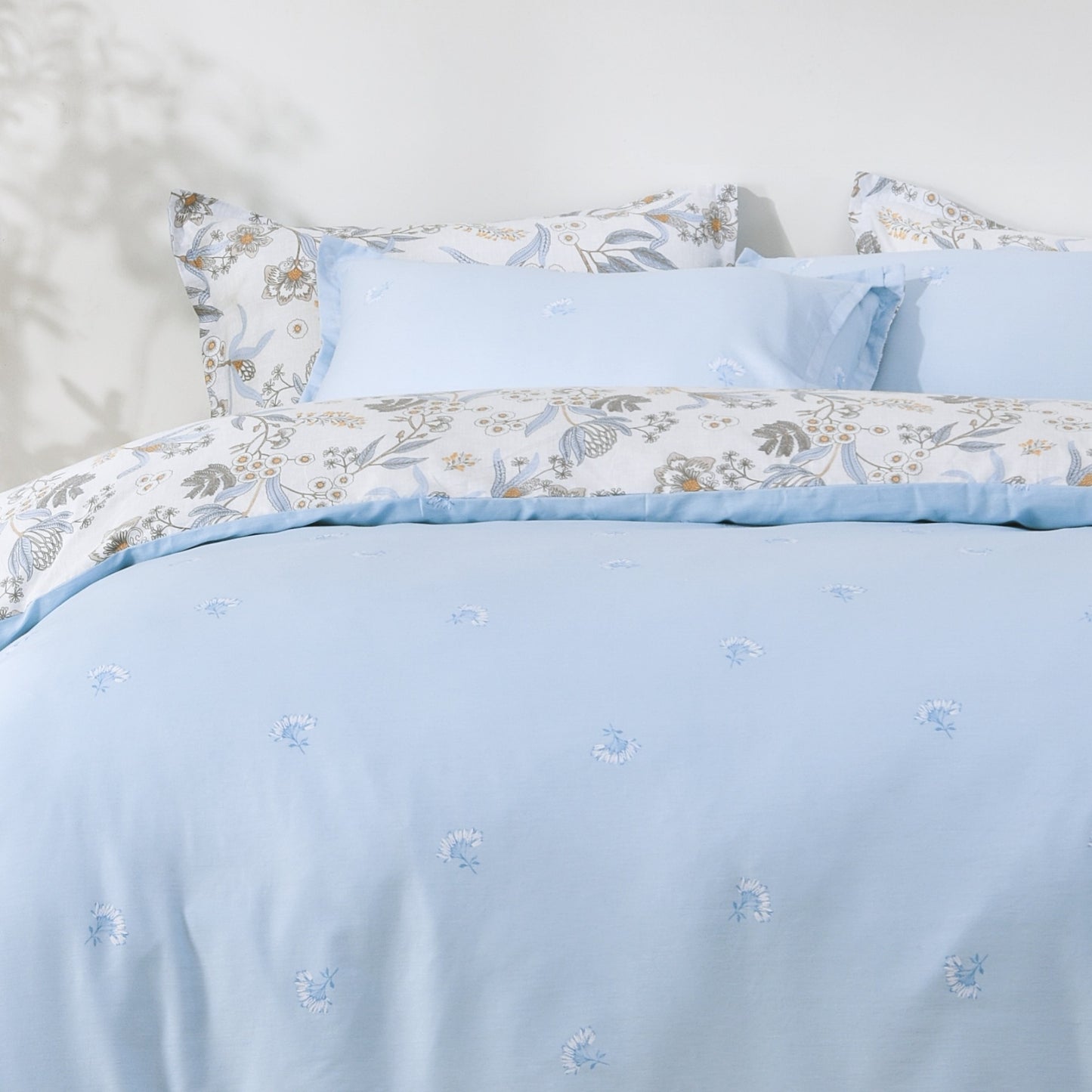 Enjoy the refreshing style of our Calandra reversible cotton quilt cover set - featuring a detailed botanical floral on one side and a subtle flower motif on sky blue on the reverse. Made of breathable, 100% cotton, Dreamaker's reversible printed quilt cover sets have two unique prints on both sides of the quilt cover and matching pillowcases, giving you two styles in one.